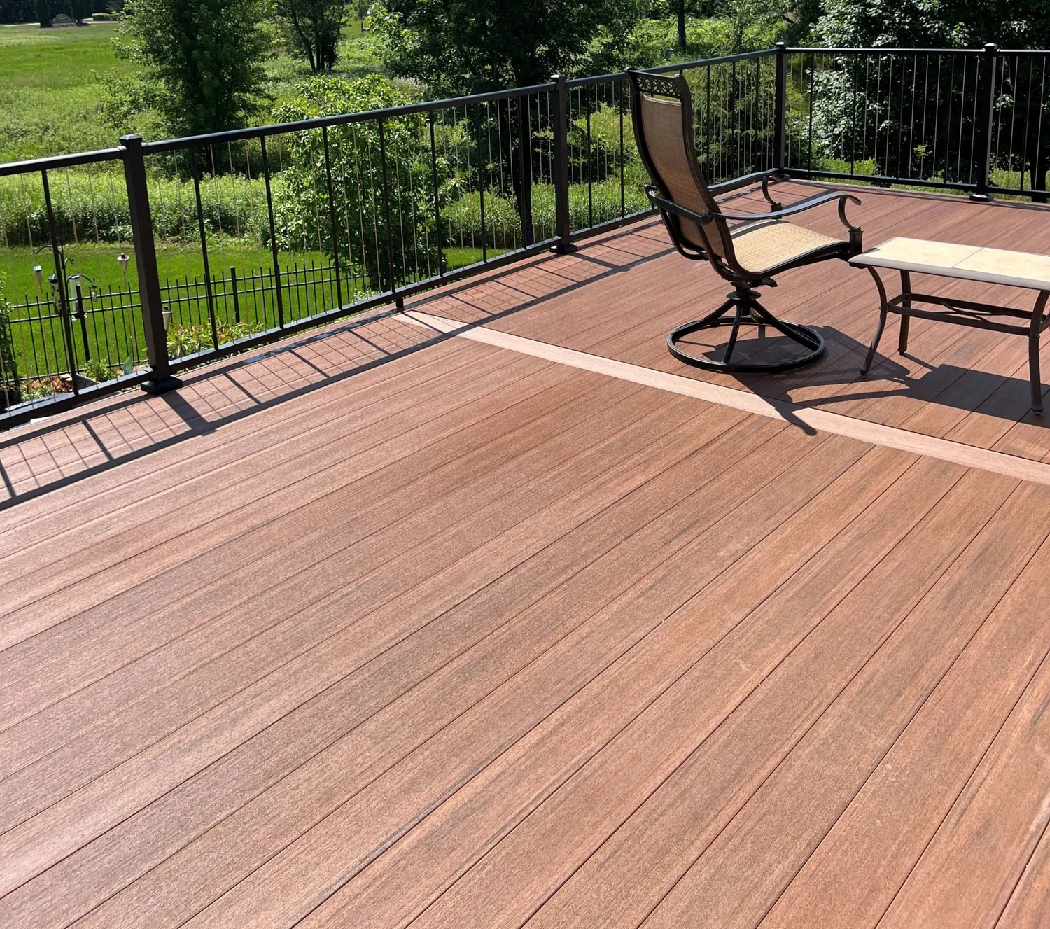 • Azek Mahogany decking with a single vertical board down the middle of the deck.
